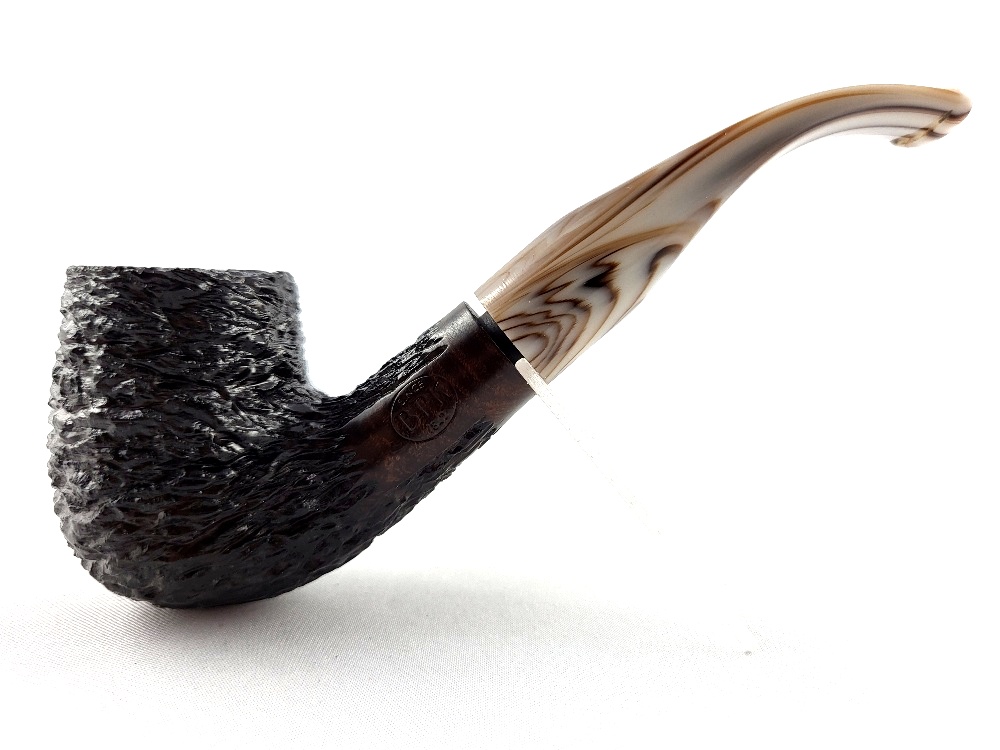 Ohnutá dýmka v rustikovém provedení s barevným akrylovým náustkem.