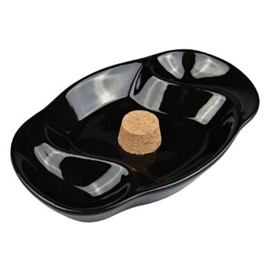 Dýmkový popelník s odkladem na dvě dýmky. Černý keramický popelník v lesklém provedení je vybavený korkovým trnem na vyklepání dýmky a prostorem pro odložení. Oválný popelník na dýmku má rozměry 22,5x14,5x4cm. Dýmkový popelník je dodávaný v kartonové krabici.