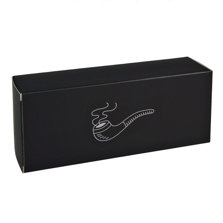 Dárková krabička na dýmku. Zavírací papírová krabička na dýmku v matném černém provedení je na čelní a zadní straně zdobená motivem dýmky. Krabička na dýmku je vyrobená z pevného kartonu a je vhodná pro většinu dýmek běžného tvaru a délky. Udělejte radost přátelům nákupem kvalitní dýmky a darujte ji v této dárkové krabičce. Velikost krabičky 17,2x7x4,5cm.