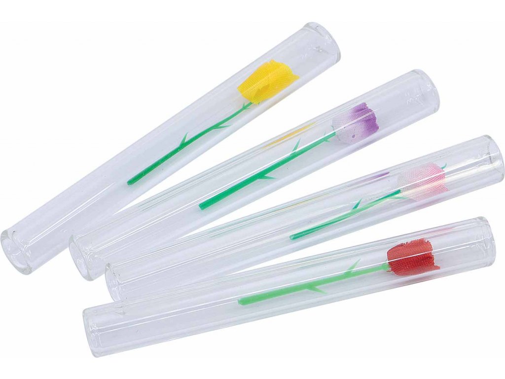 Čirá rovná skleněnka s květinou uvnitř z odolného žáruvzdorného borosilikátového skla tloušťky 2 mm.