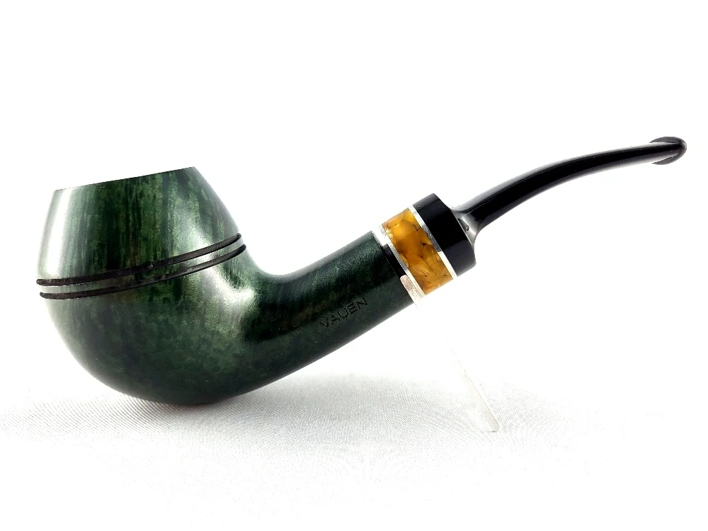 Báječný pocit, když cítíte tuto dýmku ve své dlani vzniká jednak díky optickému harmonickému dojmu. Struktura prstýnku působí nostalgicky díky začlenění jantaru, třpytícího se zlatem Baltického moře. Toto zapůjčuje prstýnku atraktivní hloubku a sytost a vytváří bohatý kontrast se zelenou barvou dýmky. Sametově matný, ručně voskovaný povrch dýmky vám pak dává především pocítit, jak příjemné je mít ji v ruce.