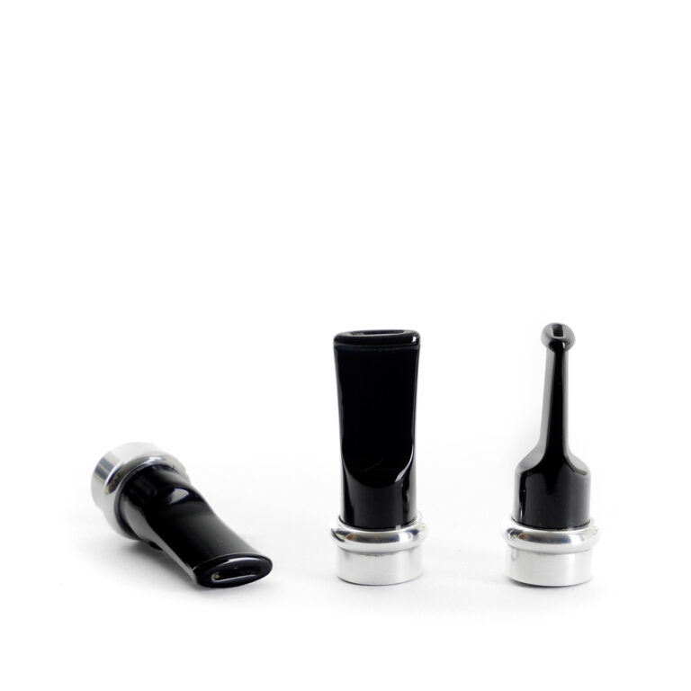 Akrylový náustek černý ve vysokém lesku, kratší. Je osazen stříbrným hliníkovým prstencem.