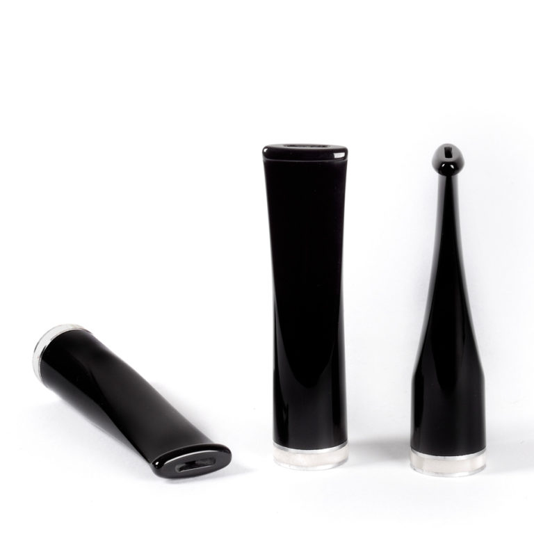 Černý akrylový kuželový náustek s kovovým kroužkem a bílou vložkou ve vysokém lesku.