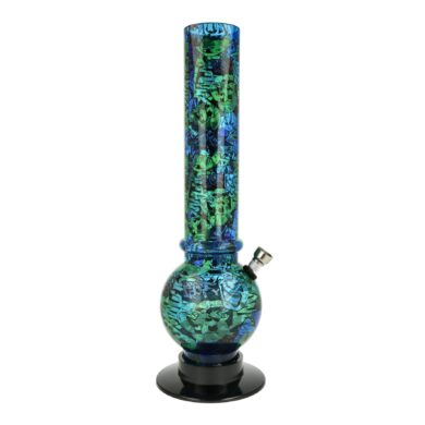 Akrylový bong Graffiti. Transparentní modrý bong s potištěným povrchem atraktivním motivem Graffiti. Akrylový bong je vyrobený z tvrzeného plastu tloušťky 2,5 mm. Plastový bong je vybavený kovovým dvoudílným chillumem se šroubovacím kotlíkem se sítkem.