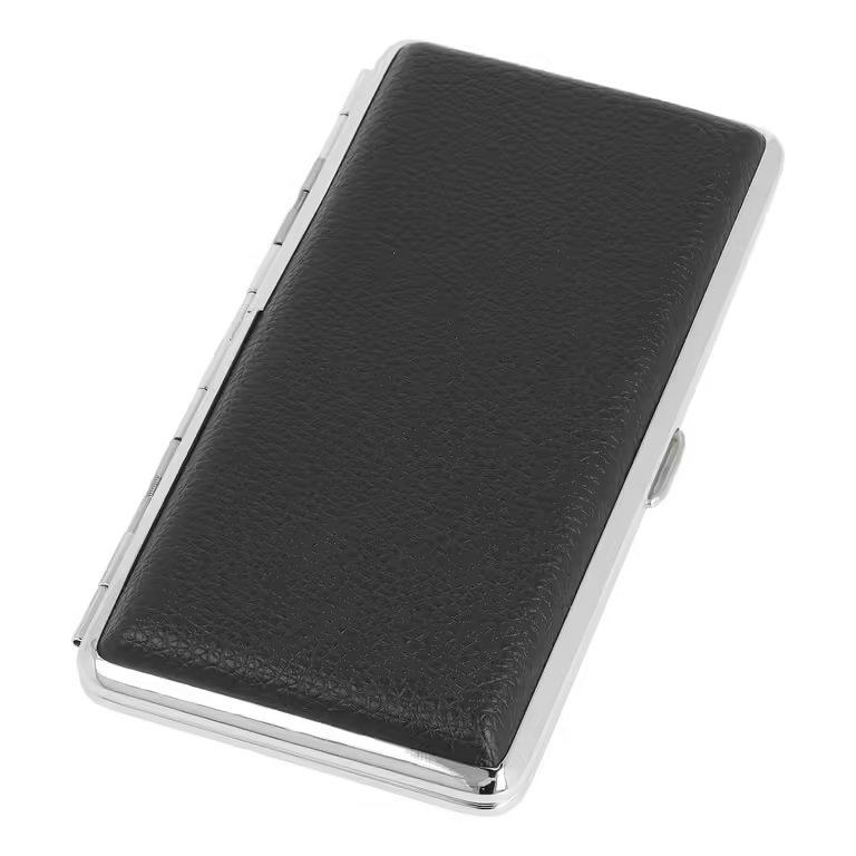 Koženková tabatěrka na dlouhé stovkové cigarety, 12 ks cigaret běžného průměru (King Size). Povrch pouzdra Black je v černém polomatném provedení s jemnou texturou v kombinaci s chromovým kovovým rámečkem. Cigaretové pouzdro má přední a zadní stranu stejnou. Cigarety jsou zajištěny plíškem s pružinkou. Tabatěrku dodáváme v papírové krabičce.