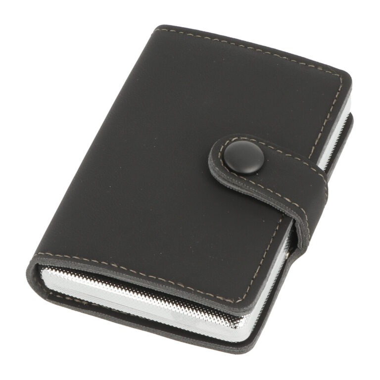 Koženková tabatěrka na dlouhé stovkové cigarety, 8 ks cigaret běžného průměru (King Size). Černé pouzdro Wallet má povrch v hladkém matném provedení. Kovový prostor pro cigarety je uzavřený v koženkovém pouzdře. Cigarety jsou zajištěny plíškem s pružinkou. Uvnitř pouzdra najdeme praktickou kapsu na peníze nebo platební kartu. Celé pouzdro je pevně uzavřené pomocí patentu. Zadní a přední strana pouzdra je stejná. Tabatěrku dodáváme v kartonové krabičce.