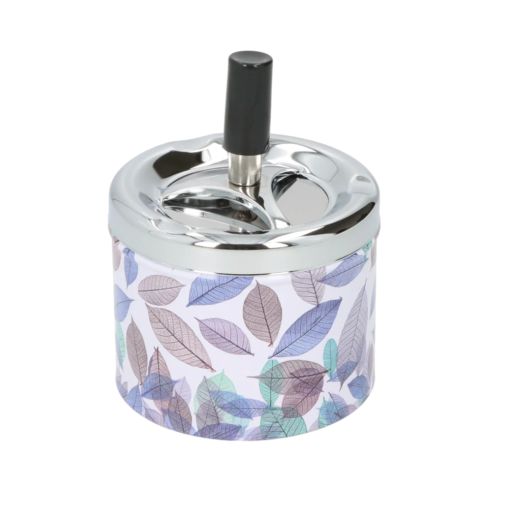 Venkovní cigaretový popelník otočný Angelo Lila. Samozhášecí kovový popelník na cigarety nejen pro venkovní použití má bílý povrch zdobený lístečky. Víčko popelníku je v lesklém chromovém provedení. Popelník je dodávaný v kartonové krabičce.