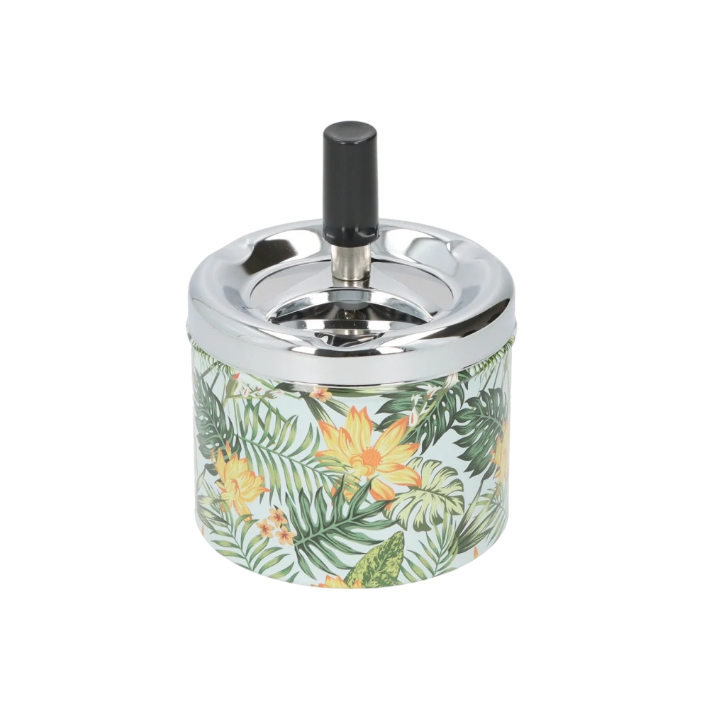 Venkovní cigaretový popelník otočný Angelo Tropical. Samozhášecí kovový popelník na cigarety nejen pro venkovní použití má zelenkavý povrch zdobený květinami. Víčko popelníku je v lesklém chromovém provedení. Popelník je dodávaný v kartonové krabičce.