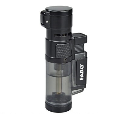 Doutníkový zapalovač Faro Jet Flame Triple. Atraktivní kovový tryskový zapalovač na doutníky v metalické provedení kombinovaný s plastovým zásobníkem plynu, kde je možné vidět jeho hladinu. Po stisknutí tlačítka se horní kryt turbo zapalovače odklopí, tři trysky se zapálí a vznikne silný plamen. Zapalovač je vhodný nejen pro zapálení vašeho oblíbeného doutníku, ale i pro zapálení uhlíků ve vodní dýmce nebo uhlí ve vašem grilu. Ve spodní části je umístěn plynový plnící ventil a regulace intenzity plamene. Výška zapalovače 8cm.