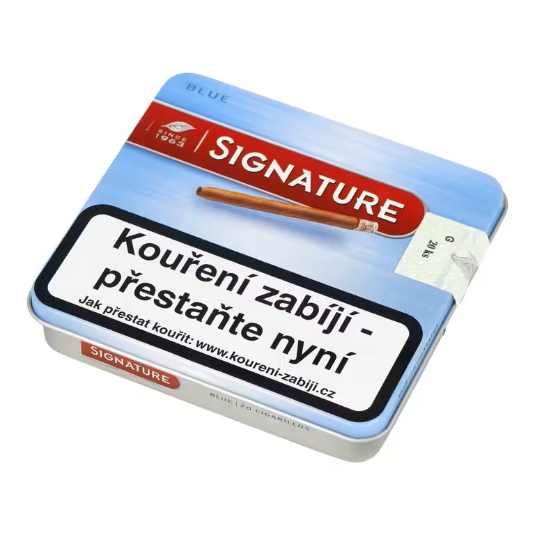 Doutníky Cafe Creme Signature Blue. Cigarillos lahodné chuti s lehkým aroma kávy s nádhernou chutí a vůní. Doutníčky Cafe Creme jsou balené po 20 ks v plechové krabičce.