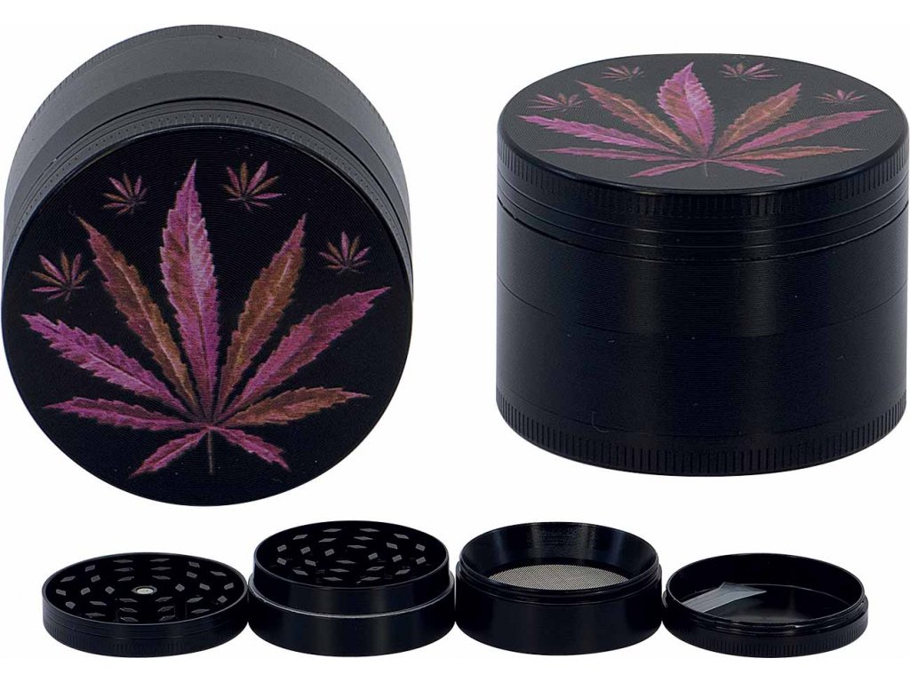 Atraktivní čtyřdílná drtička se závitem, sítkem a zásobníkem na tabák je v černém metalickém provedení. Na horní straně drtiče najdeme motivy listu. Drtič na tabák s hladkým lesklým povrchem je vyrobený z kvalitního hliníku CNC technologií. Jednotlivé díly drtičky jsou pevně spojené na závit, víčko je na magnet. Precizně broušené ostří nožů ve tvaru diamantu velmi jemně nadrtí vaši směs do požadované hrubosti.