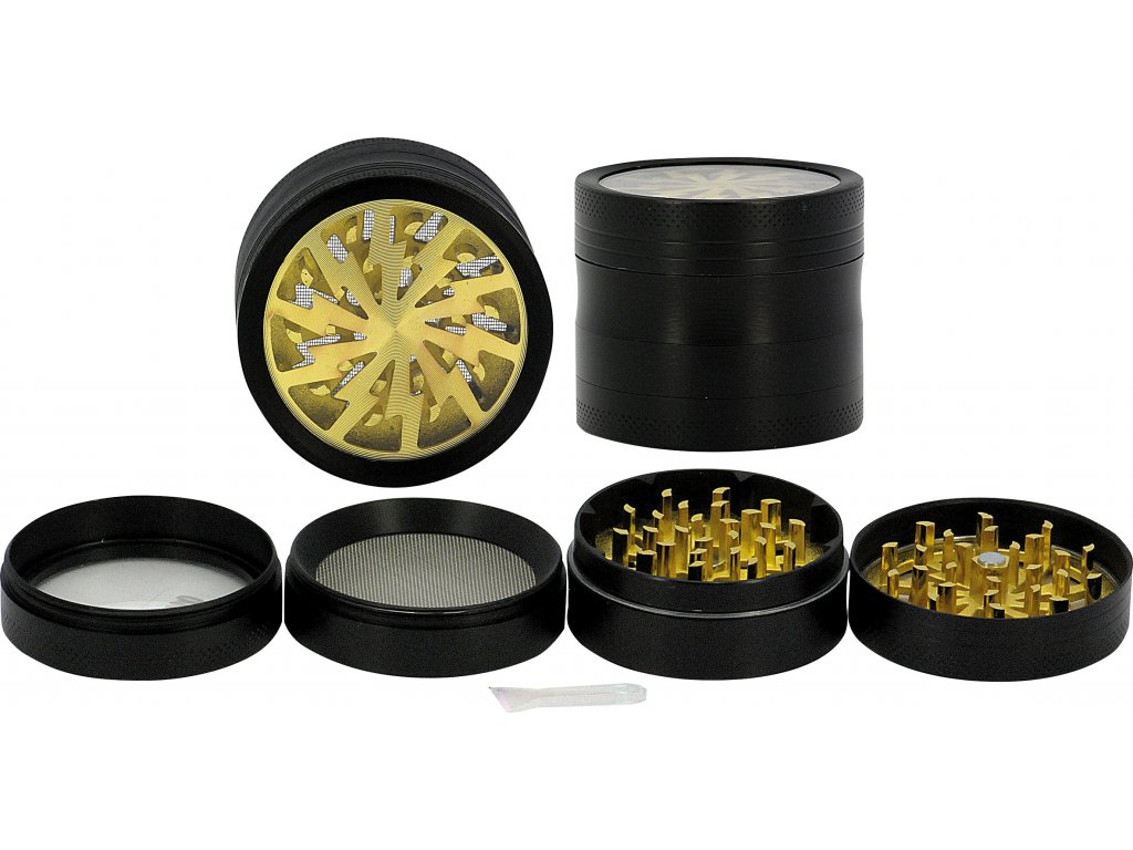 Atraktivní čtyřdílná drtička se závitem a zásobníkem na tabák je v černé metalickém provedení se zlatými prvky. Na horní straně drtiče najdeme motiv blesku. Drtič na tabák s hladkým lesklým povrchem je vyrobený z kvalitního hliníku CNC technologií. Jednotlivé díly drtičky jsou pevně spojené na závit, víčko je na magnet. Precizně broušené ostří nožů ve tvaru diamantu velmi jemně nadrtí vaši směs do požadované hrubosti.
