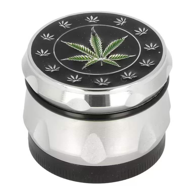 Kovový drtič tabáku Canabis. Čtyřdílná drtička se závitem, sítkem a zásobníkem na tabák je v chromovém lesklém provedení kombinované s barevnými prvky. Drtička na tabák ihned zaujme víčkem s 3D motivem Canabis, který je zalitý v barevném lesklém epoxydu. Jemně broušený povrch kovového drtiče je zpracovaný CNC technologií. Jednotlivé díly drtičky jsou pevně spojené na závit, víčko je na magnet. Precizně broušené ostří nožů ve tvaru diamantu velmi jemně nadrtí vaši směs do požadované hrubosti.