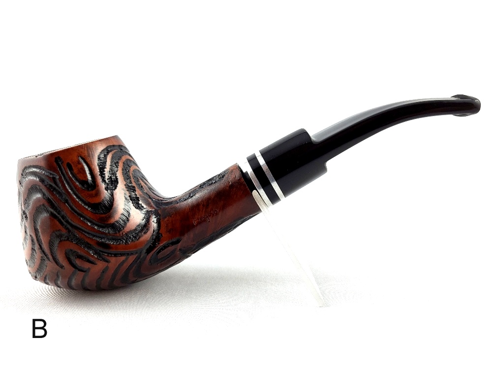 Angelo dýmka v hladkém provedení s rytým zdobením z vysoce kvalitního briárového dřeva. Akrylátový náustek s vysokým leskem a jemnými kovovými kroužky ve stříbrné barvě je osazen 9mm filtrem. Velmi povedená dýmka klasického tvaru v moderním pojetí. Dýmka je vyrobena v Itálii papírové krabičce.