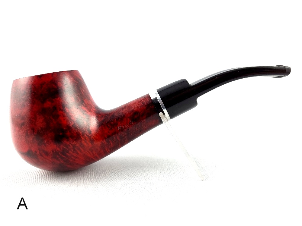 Angelo dýmka v hladkém provedení z vysoce kvalitního briárového dřeva. Akrylátový náustek krásného tvaru se širokým kovovým kroužkem ve stříbrné barvě je osazen 9mm filtrem. Zahnutá dýmka je vyrobena v Itálii a je dodávaná v papírové krabičce. Na boku je dýmka zdobená rytým nápisem "Angelo".