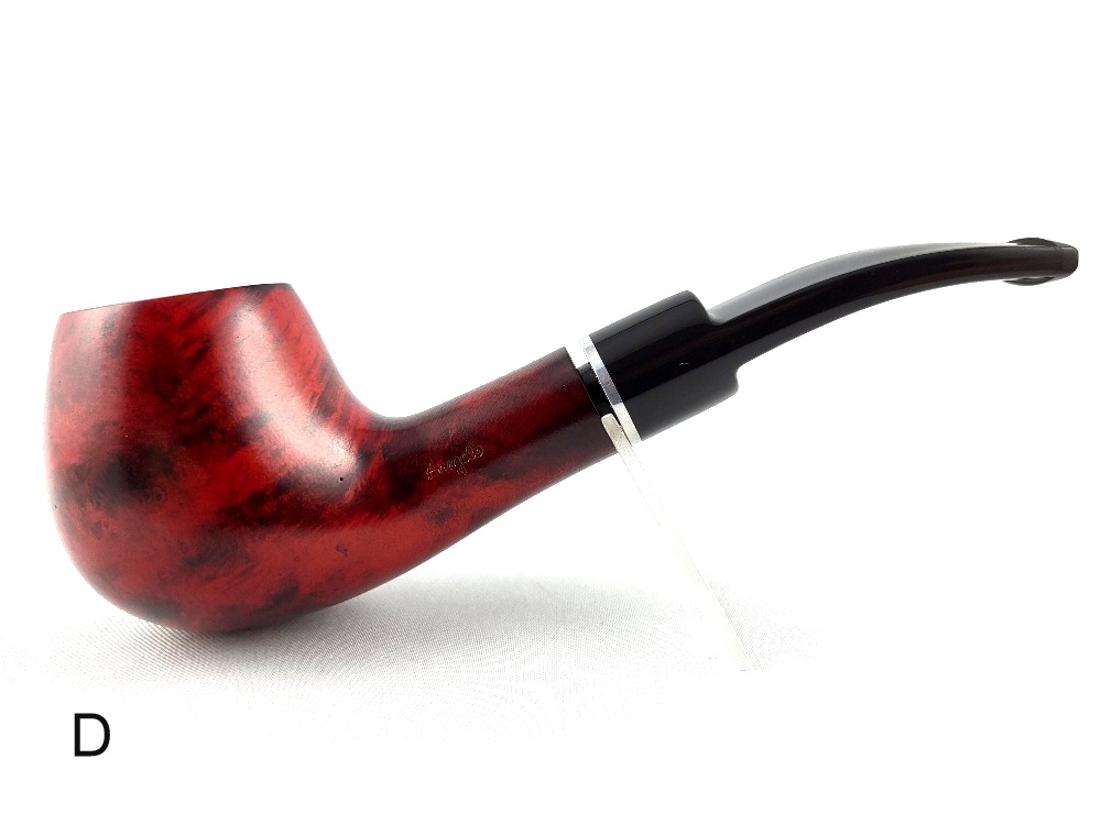Angelo dýmka v hladkém provedení z vysoce kvalitního briárového dřeva. Akrylátový náustek krásného tvaru se širokým kovovým kroužkem ve stříbrné barvě je osazen 9mm filtrem. Zahnutá dýmka je vyrobena v Itálii a je dodávaná v papírové krabičce. Na boku je dýmka zdobená rytým nápisem "Angelo".