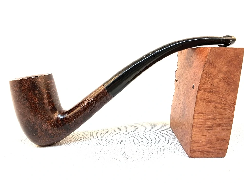 Ohnutá elegantní dýmka v hladkém provedení s užší hlavičkou s krásnou kresbou dřeva. Delší ebonitový náustek s kovovým chladičem.