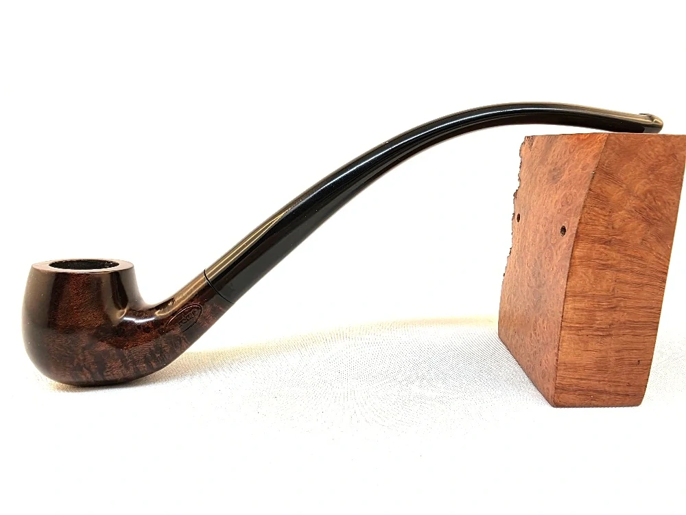 Ohnutá dýmka v hladkém provedení s drobnou hlavičkou a dlouhým černým náustku bez filtru.