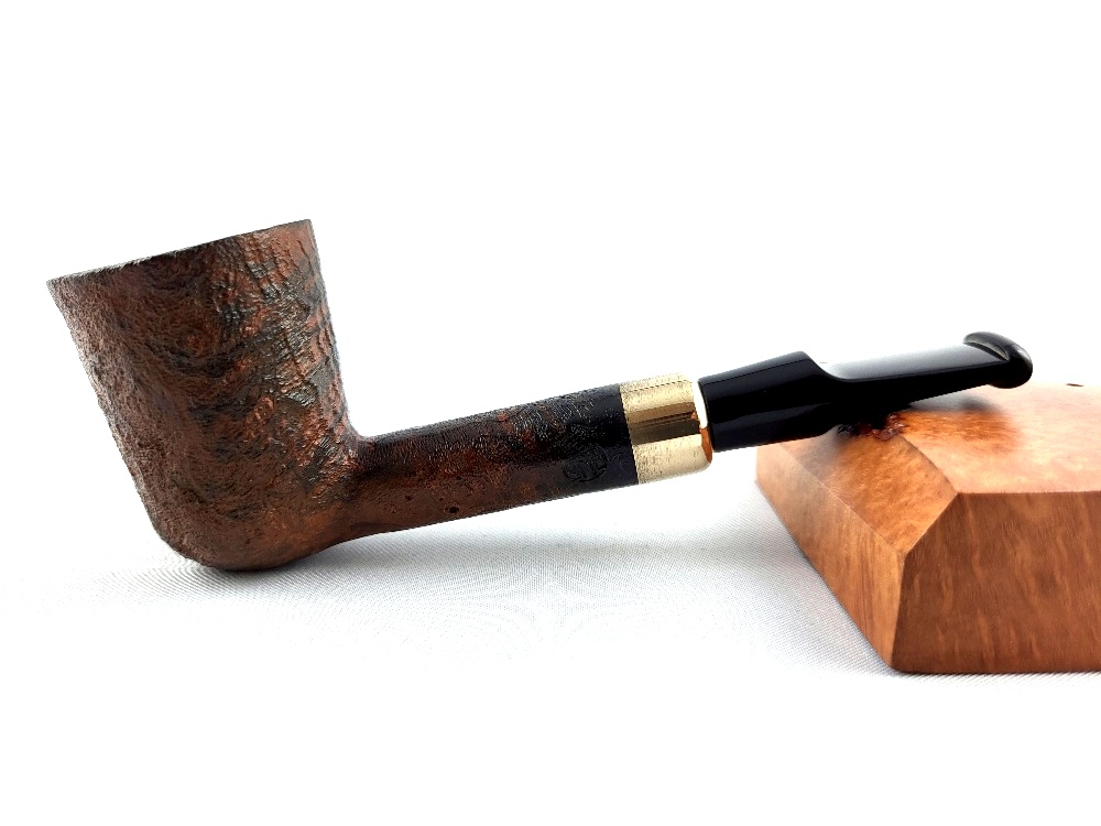 Dýmka z dílny Petra Nováka je jemně pískovaná včetně vršku hlavičky. Moderní Dublin s úzkým dlouhým krčkem kovovým kroužkem a krátkým náustkem.
