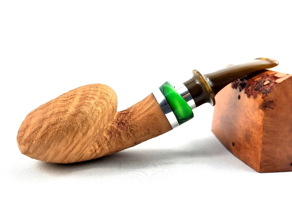 Dýmka v pískovaném provedení v přírodní barvě s hnědý žíhaným akrylovým náustkem a výrazným zeleným prstýnkem.