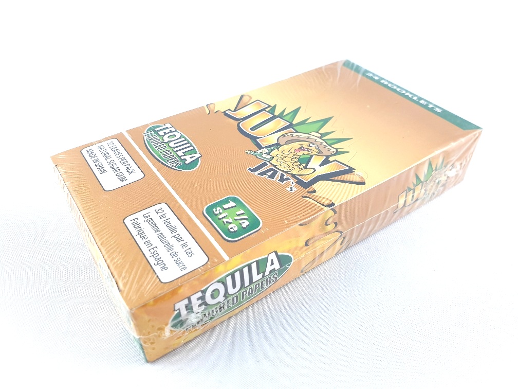 Velmi oblíbené cigaretové papírky značky Juicy Jay´s v ochuceném provedení ve velikosti 1 1/4. Jedinečná metoda trojitého namáčení papírku v příchuti, ovlivňují vůni dýmu. Jsou sladké při nalízávání. Papírek má barevný potisk. Příchuť: Tequila. Tyto papírky jsou vyrobené z přírodního materiálu. Kromě toho jsou tyto papírky velmi tenké a zároveň mají vodoznak, který způsobuje pomalé a rovnoměrné hoření.