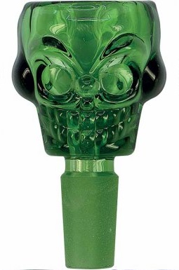 Náhradní skleněný kotlík do bongu Skull. Atraktivní skleněný kotlík je zhotovený ve tvaru lebky s korunkou v zeleném provedení. Kotlík je vyrobený z kvalitního žáruodolného borosilikátového skla. ∅12,5 - 14,5mm