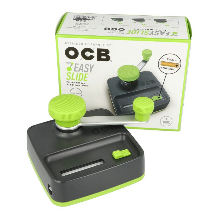 Plnička cigaretových dutinek OCB Easy Slide v šedo zeleném provedení. Manuální páková plnička umožňuje plnit cigaretové dutinky jednotlivě jedním pohybem. Tlaková plnička je určená pro plnění dutinek klasické velikosti King Size o průměru 8 mm s běžným filtrem nebo dutinek s dlouhým filtrem stejného průměru. Cigaretové dutinky jsou plněné pomocí kovového hrotu. Kryt kovového mechanismu je z odolného plastu, páka je precizně vyrobená z kvalitního hliníku. Vyrobení vlastní cigarety je rychlé a jednoduché - pohybem páky zcela nahoru (až uslyšíte cvaknutí) odsunete kryt komory na tabák, zvolíte typ plněné dutinky Regular nebo Extra (Regular klasická délka filtru, Extra dlouhý filtr) a naplníte ji svojí oblíbenou tabákovou směsí. Cigaretovou dutinku nasadíte na plastový hrot. Plničku cigaret přidržíte a jednoduchým pohybem páky z horní strany dolů naplníte dutinku tabákem a cigareta je hotová. Spodní plastový kryt kovového mechanismu je vybavený protiskluzovými gumovými podložkami, které zabraňují pohybu plničky při plnění. V tomto krytu také najdete praktické plastové pěchovátko tabáku, které využijete při plnění tabákové komory. Plnička cigaret je dodávaná v originální kartonové krabici.