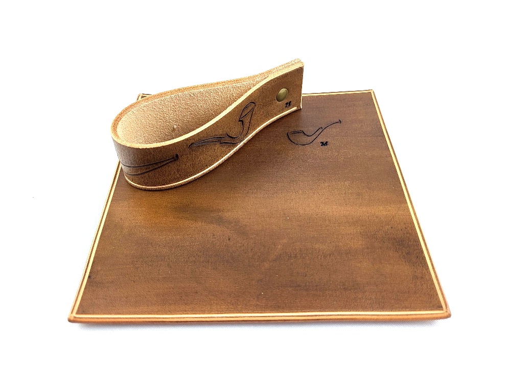 Krásná, kožená podložka na přípravu Vašeho oblíbeného tabáku do dýmky. Podložka je zdobena ručně řezanou dýmkou.