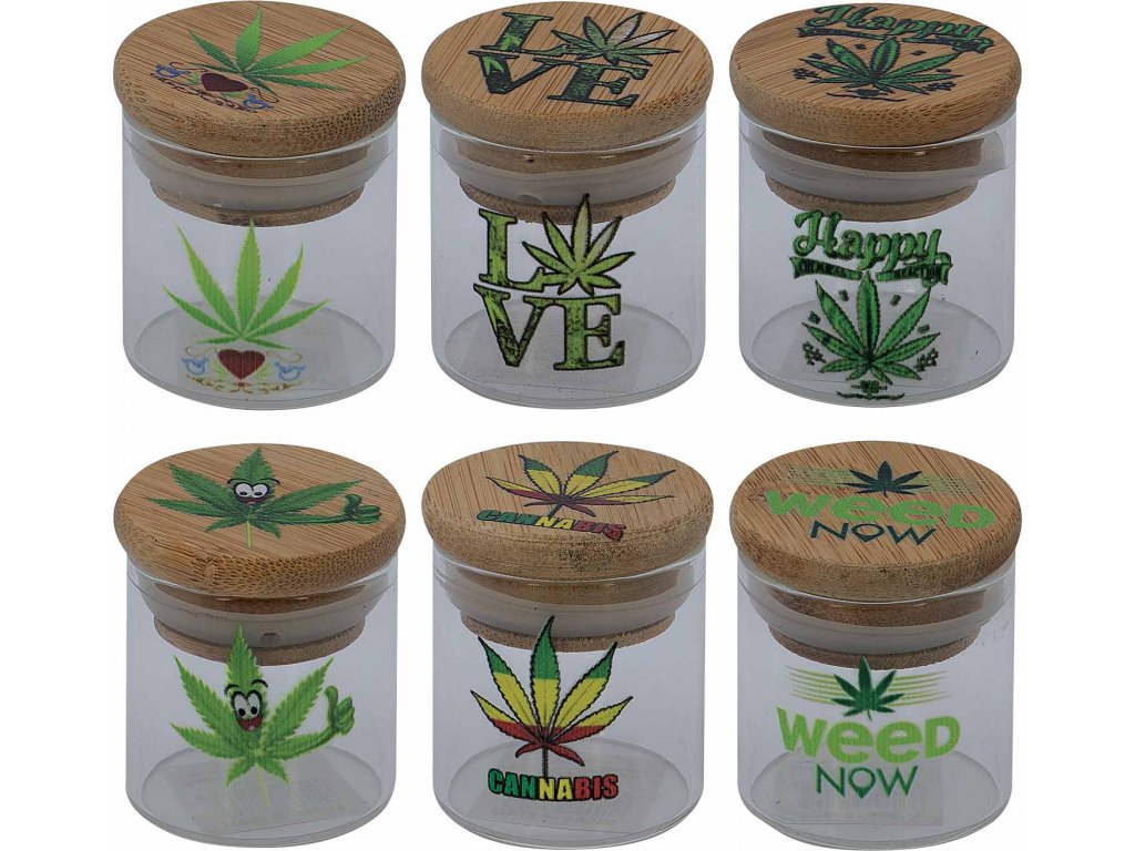 Skleněná dóza na tabák Remo průměr 40 mm výška 48 mm hermetický bambusový uzávěr mix dekorací celý popis