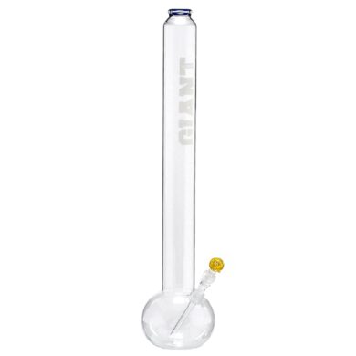 Kus pořádného skla, to je mohutný skleněný bong Giant. Transparentní rovný bong doplňují prvky v modrém a žlutém tónu. Na čelní straně je obrovský bong zdobený matným bílým logem Giant Series. Bong ukončeným silným modrým hrdlem je ve spodní části vybavený otvorem pro turbo. Oproti standardním bongům je tento prémiový bong vyrobený z tepelně odolného borosilikátového skla tloušťky 5 mm. Dlouhý dvoudílný chillum bongu je ukončený samostatným kotlíkem s velkým otvorem.