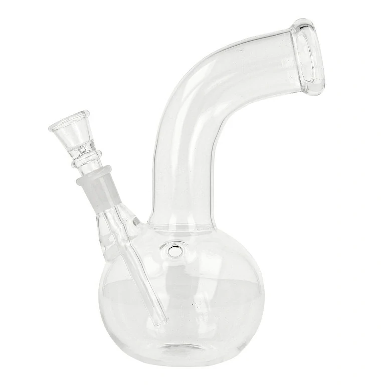 Skleněný bong Handmade Semi. Zahnutý transparentní bong je ukončený silnějším hrdlem. Oproti standardním bongům je tento bong vyrobený z tepelně odolného borosilikátového skla tloušťky 2 mm. Ve spodní části najdeme otvor pro turbo. Jednodílný chillum je ukončený nalisovaným kotlíkem s menším otvorem cca 3 mm.