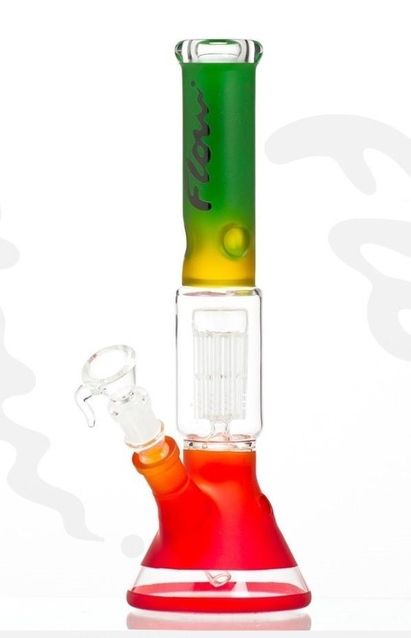 Skleněný transparentní bong tvaru Beaker v barevném provedení má na čelní straně logo. Ice bong ukončený silným hrdlem je vybavený "výstupky" pro udržení kostek ledu k ochlazení kouře. Perkolace Arm s deseti rameny kouř dokonale rozděluje, zjemňuje a tím ještě více napomůže k jeho ochlazení. Ve spodní části najdeme otvor pro turbo s gumovou záslepkou. Masivní základna napomáhá k výborné stabilitě bongu. Oproti standardním bongům je tento prémiový bong vyrobený z tepelně odolného borosilikátového skla tloušťky 5 mm. Dvoudílný chillum je ukončený samostatným kotlíkem s praktickým držátkem a větším otvorem (cca 8 mm).
