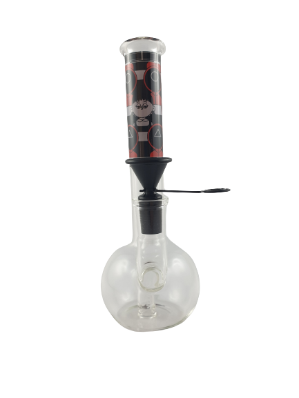 Skleněný bong s motivem seriálu Squid Game . Malý tvarově zajímavý bong v čirém provedení je na čelní straně zdobený tištěným motivem. Bong ukončeným menším hrdlem a je ve spodní části vybavený vestavěný chillum a kovovým kotlikem.