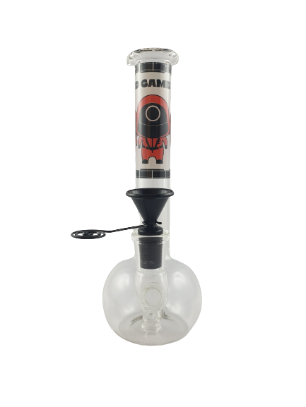 Skleněný bong s motivem seriálu Squid Game . Malý tvarově zajímavý bong v čirém provedení je na čelní straně zdobený tištěným motivem. Bong ukončeným menším hrdlem a je ve spodní části vybavený vestavěný chillum a kovovým kotlikem.