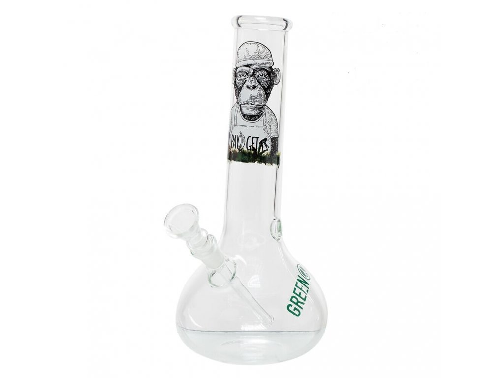 Zalomený skleněný bong Greenline. Transparentní bong je zdobený potiskem s opicí a logem Green. Bong ukončený slabším hrdlem má ve spodní části otvor pro turbo. Oproti standardním bongům je tento prémiový bong vyrobený z tepelně odolného borosilikátového skla tloušťky 2,5 mm. Jednodílný chillum bongu je ukončený nalisovaným kotlíkem s větším otvorem cca 8 mm.