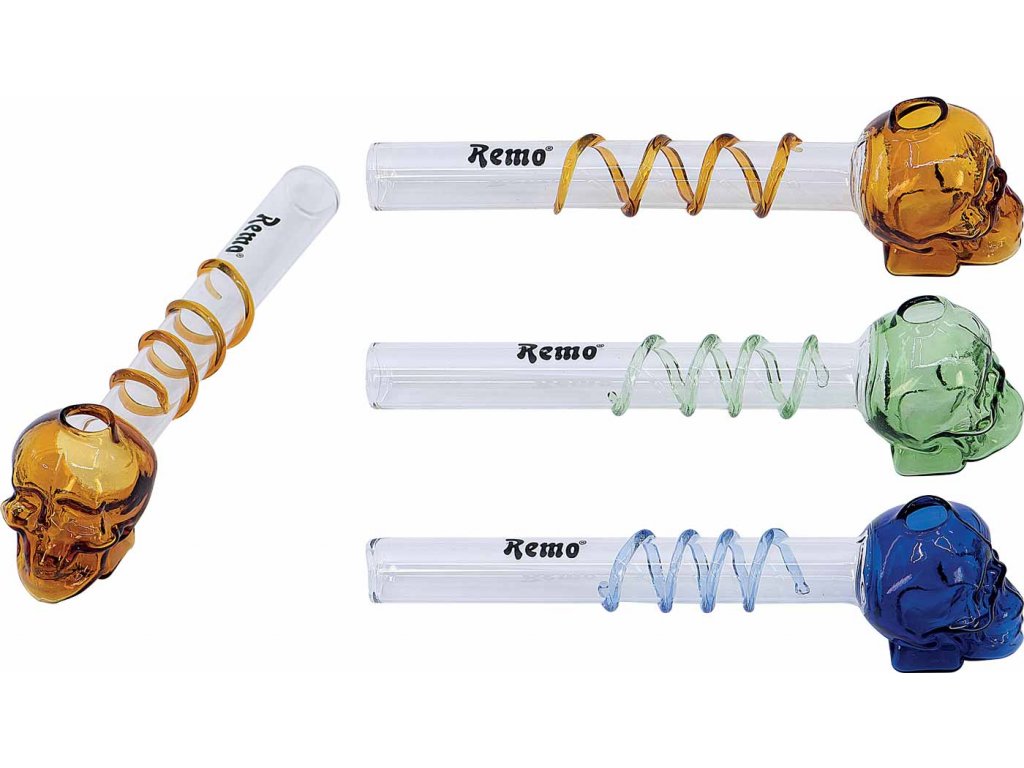 Skleněná šlukovka Lebka barevná. Rovná šlukovka z kvalitního skla. Díky svojí malé hmotnosti a zpracování lehce padne do ruky.