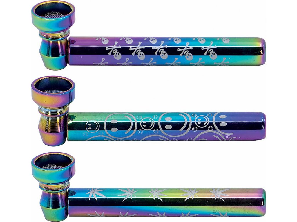 Rovná skleněná šlukovka je vyrobená z kvalitního barevného duhového skla s potiskem. Kovový kotlík se sítkem je také v duhovém provedení.