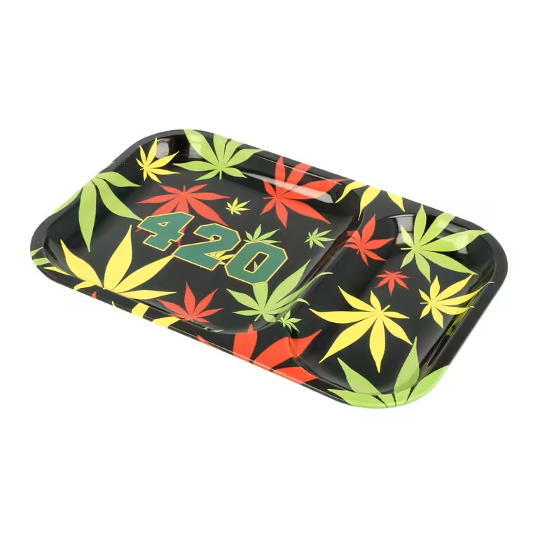 Tácek na balení cigaret colored Leaves. Plechová balící podložka s barevnými listy konopí a číslem 420 je v černém lesklém provedení. Kovový tácek k balení cigaret je rozdělený na dva odkládací prostory pro Vaše byliny nebo tabák a další kuřácké potřeby, které potřebujete při výrobě vlastních cigaret. S praktickou podložkou zamezíte nepořádku na stole a současně máte vše potřebné na jednom místě.