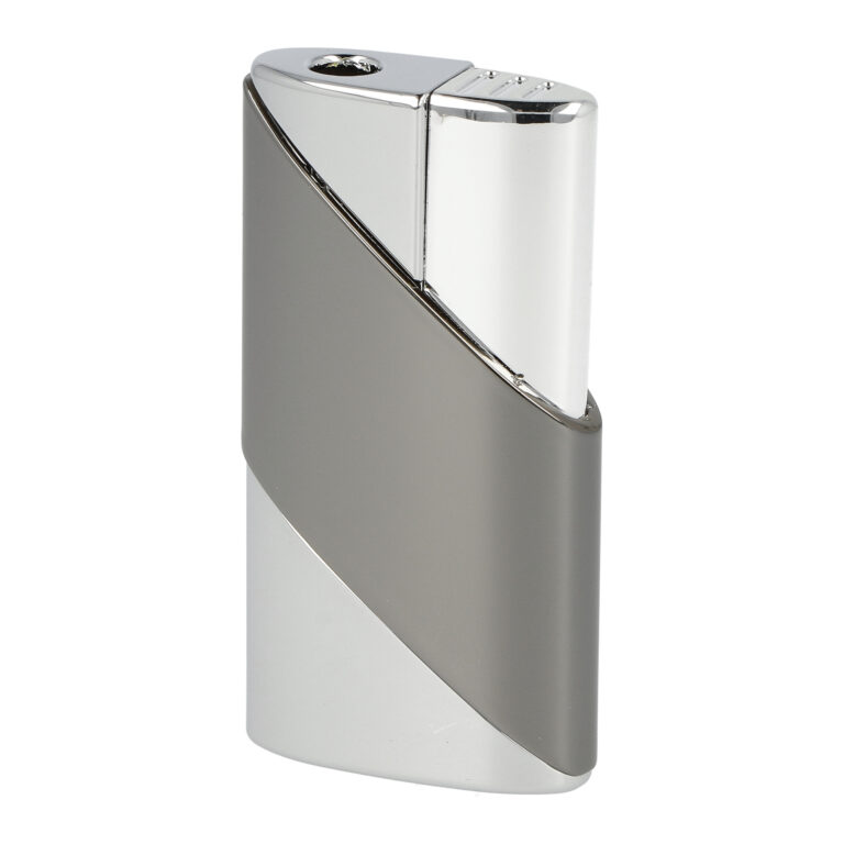 Tryskový zapalovač Eurojet Tomsk. Kovový turbo zapalovač má povrch v lesklém chromovém provedení v kombinaci se šedým šikmým pruhem. Při stisku horního tlačítka dojde k zapálení jedné trysky, která vytvoří silný plamen. Ve spodní části zapalovače najdeme plnící ventil plynu a ovládání intenzity plamene. Zapalovač je dodáván v originální dárkové krabičce. Rozměry: 3,5x6,5x1,4 cm.