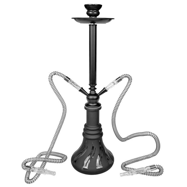 Vodní dýmka Devil Black je vysoká 57 cm. Dvoušlauchová vodní dýmka v černém tónu má tvarovanou skleněnou vázu zdobenou ornamenty. Vodní dýmka je vybavena výstupy pro dvě hadice. Gumový šlauch je ukončený plastovým náustkem a konektorem pro připojení. Kovové tělo dýmky se upevňuje nasunutím na vázu s použitím přiloženého gumového těsnění. Vodní dýmka je dodávaná v kartonové krabici.